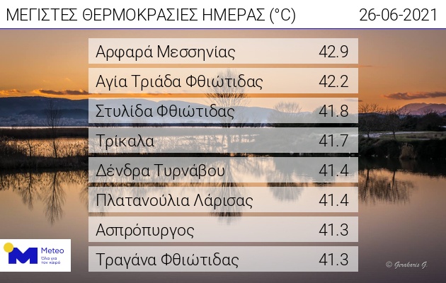 Σύμφωνα με το δίκτυο αυτόματων μετεωρολογικών σταθμών του Εθνικού Αστεροσκοπείου Αθηνών / meteo.gr οι οκτώ υψηλότερες θερμοκρασίες κατά τις μεσημεριανές ώρες του Σαββάτου 26/06, παρουσιάζονται στον παρακάτω Πίνακα.