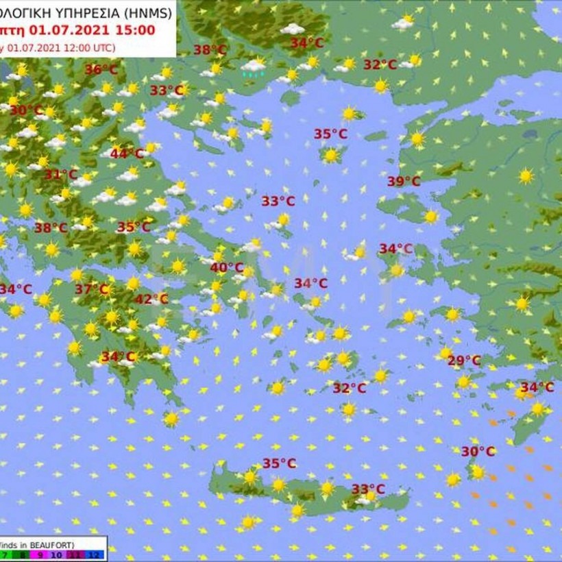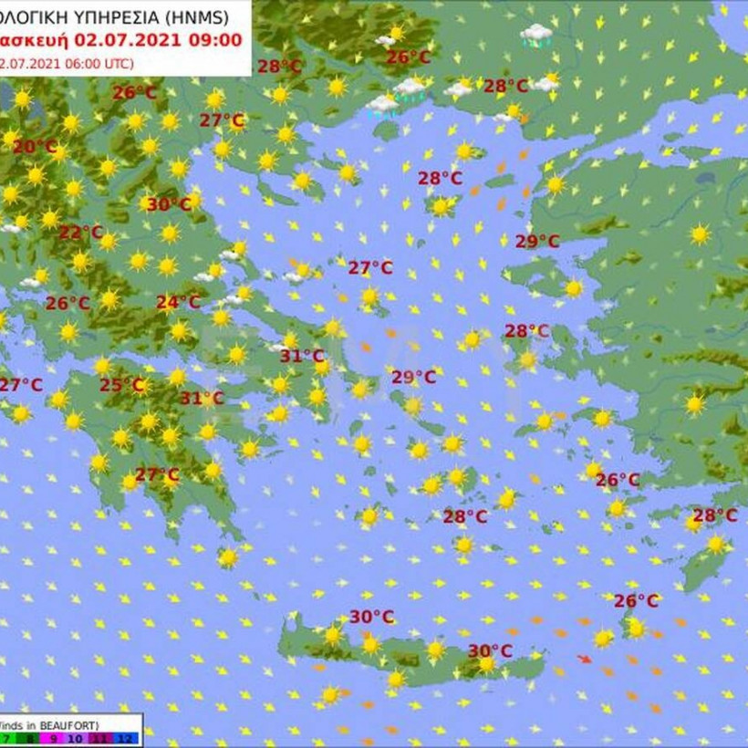 Θερμοκρασία: Από 26 έως 37 και στην Κρήτη κατά τόπους 38 με 39 βαθμούς Κελσίου.