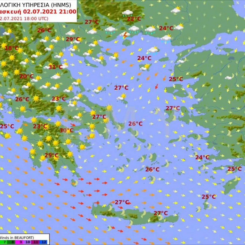 Άνεμοι: Δυτικοί βορειοδυτικοί 3 με 4 και τοπικά 5, και από τις μεσημβρινές ώρες 5 με 6 μποφόρ.