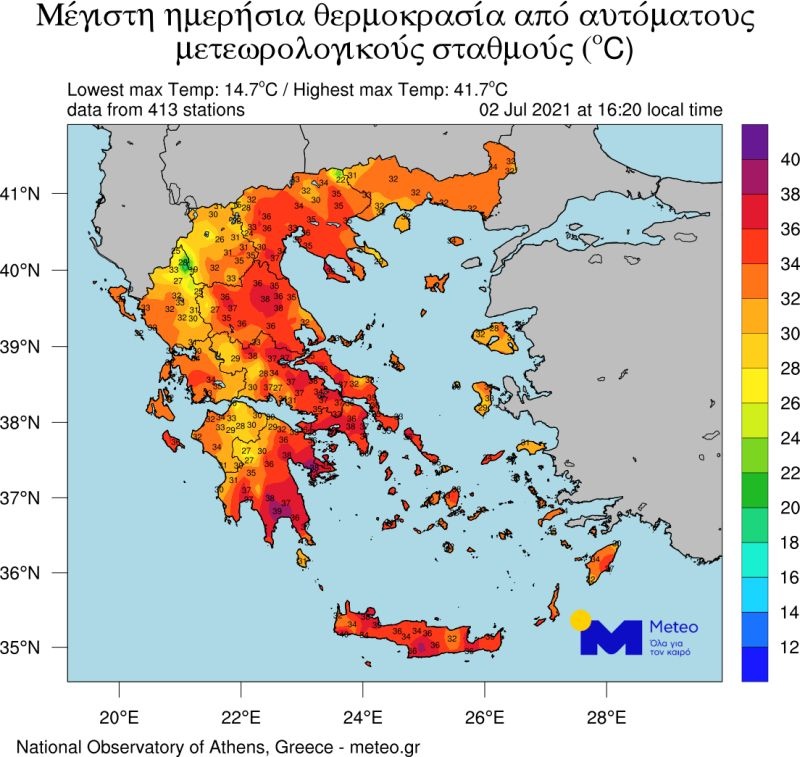 Μόνο δύο μετεωρολογικοί σταθμοί του Εθνικού Αστεροσκοπείου Αθηνών/meteo.gr ξεπέρασαν τους 40 βαθμούς, καθώς οι υψηλότερες θερμοκρασίες καταγράφηκαν στην Πελοπόννησο (Κρανίδι Αργολίδας 41,7 και Αστέρι Λακωνίας 40,6) και στην Κρήτη (39,7 βαθμοί στην Παλαιοχώρα Χανίων και 39,3 στην Πλώρα Ηρακλείου).