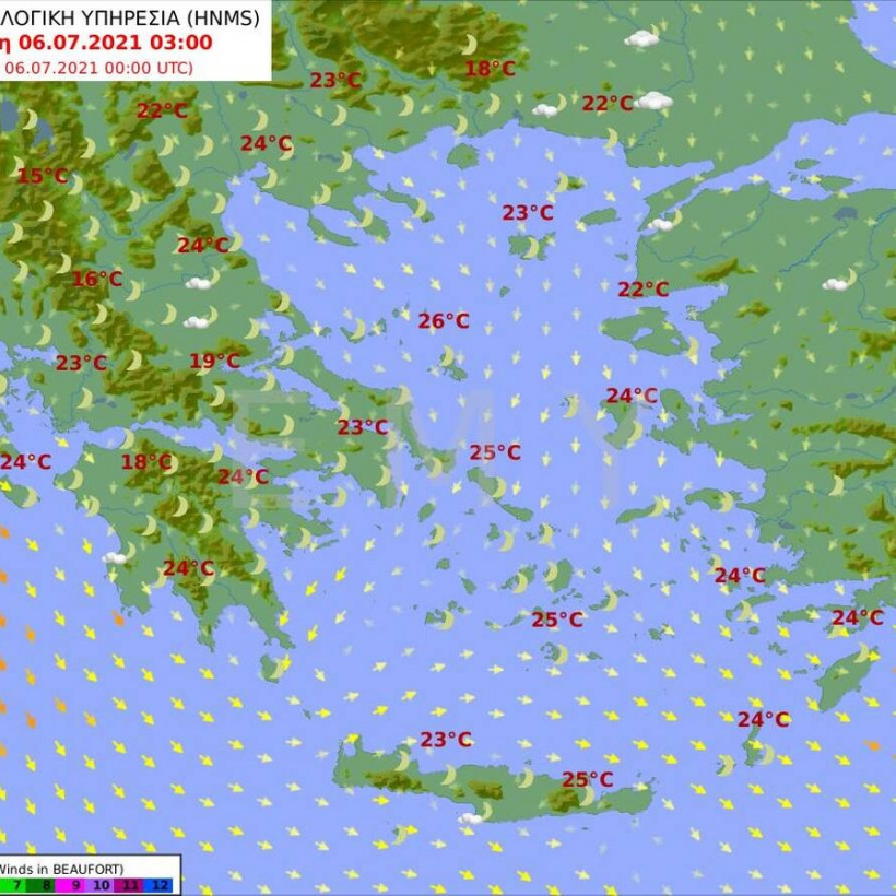 Θερμοκρασία: Από 20 έως 36 βαθμούς Κελσίου. Στην Ήπειρο η ελάχιστη 3 με 5 βαθμούς χαμηλότερη.