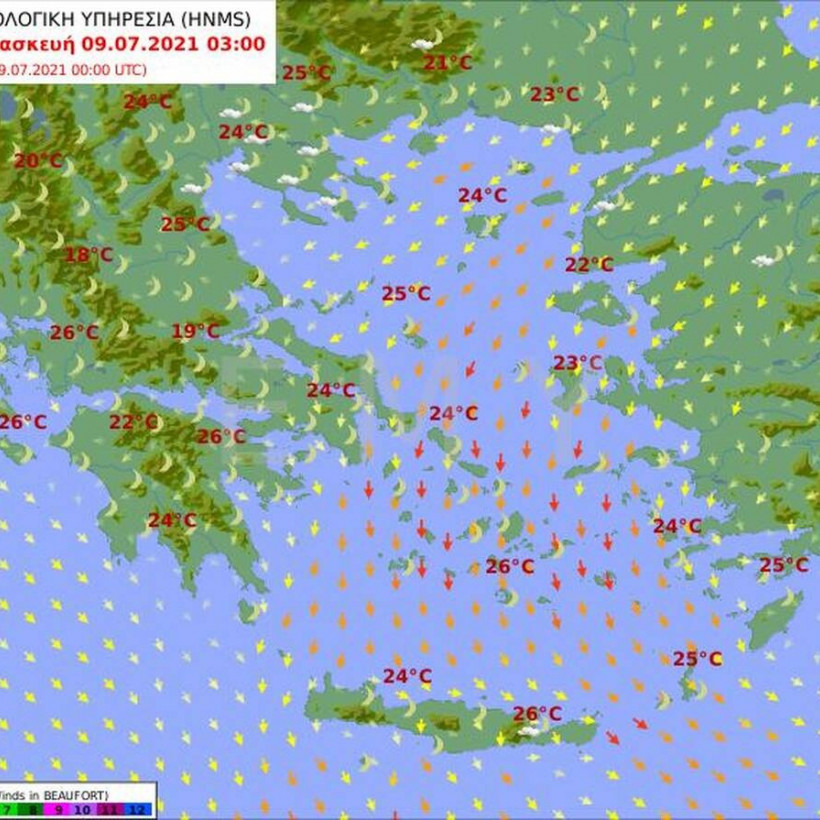 Άνεμοι: Βόρειοι βορειοανατολικοί 4 με 6 και από το μεσημέρι στα ανατολικά και τα νότια 7 μποφόρ.