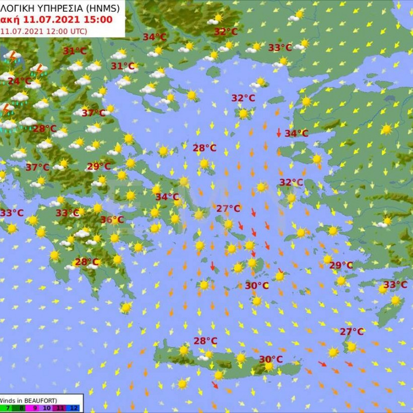 Θερμοκρασία: Από 21 έως 37 βαθμούς Κελσίου. Στα νησιά και τα παραθαλάσσια η μέγιστη 2 με 3 βαθμούς χαμηλότερη.
