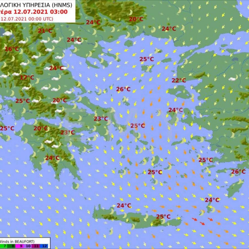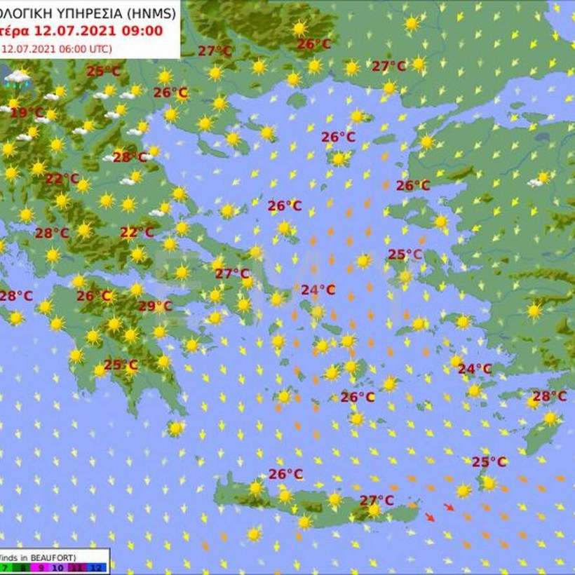 Οι άνεμοι θα πνέουν βόρειοι βορειοδυτικοί 3 με 4 και στο Αιγαίο 5 με 6 μποφόρ.