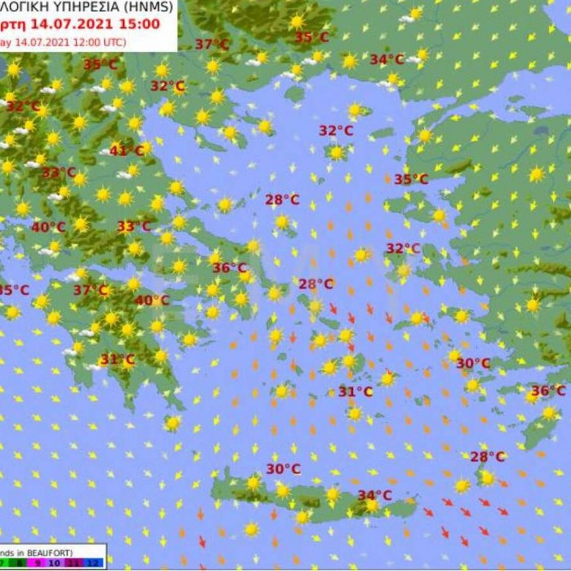 Θερμοκρασία: Από 21 έως 39 και κατά τόπους στα ηπειρωτικά έως 40 βαθμούς Κελσίου. Στα νησιά και τα παραθαλάσσια η μέγιστη 3 με 4 βαθμούς χαμηλότερη.
