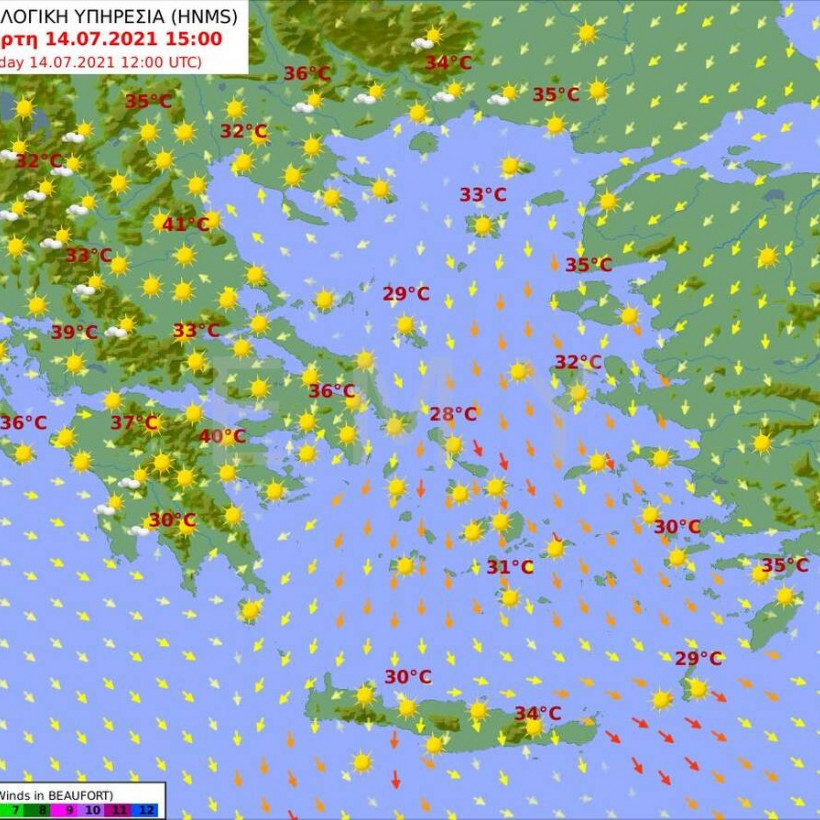 Ο χάρτης των θερμοκρασιών από την ΕΜΥ για σήμερα Τετάρτη 14 Ιουλίου