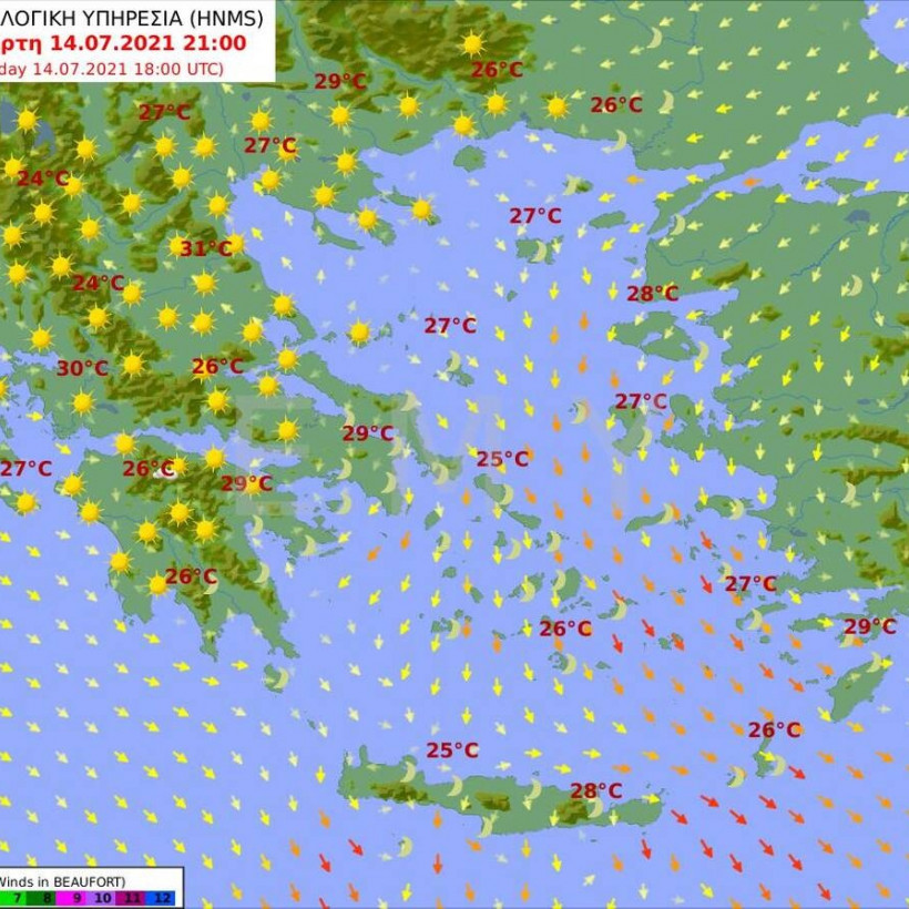 Οι άνεμοι θα πνέουν δυτικοί βορειοδυτικοί 4 με 6 και στο βόρειο Αιγαίο βόρειοι βορειοανατολικοί 3 με 5 μποφόρ.