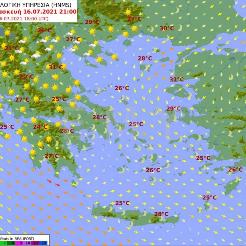 Θερμοκρασία: Από 21 έως 37 βαθμούς Κελσίου και στα νησιά και τα παραθαλάσσια η μέγιστη 3 με 4 βαθμούς χαμηλότερη.