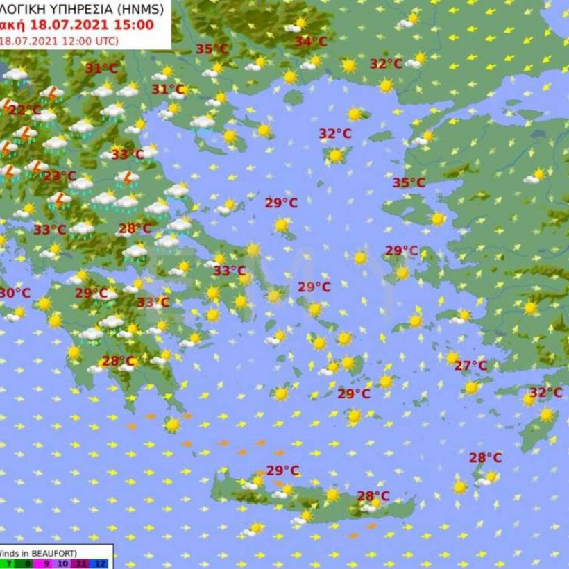 Θερμοκρασία: Από 18 έως 35 βαθμούς Κελσίου και στα νησιά και τα παραθαλάσσια η μέγιστη 3 με 4 βαθμούς χαμηλότερη.