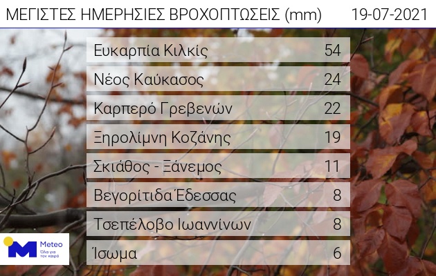 Σύμφωνα με το meteo.grαξιόλογες βροχοπτώσεις και τοπικά ισχυρές καταιγίδες εκδηλώθηκαν τη Δευτέρα 19 Ιουλίου 2021.