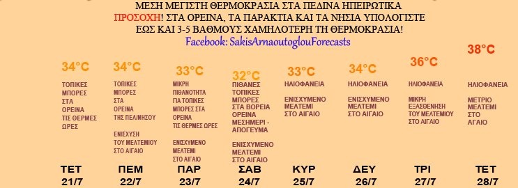 Ο Σάκης Αρναούτογλου υπενθυμίζει, τέλος, ότι όσοι βρίσκονται στα παράκτια, τα νησιά και τα ορεινά θα πρέπει να υπολογίζουν και να αναμένουν 3-5 βαθμούς χαμηλότερη θερμοκρασία από αυτή που αναφέρεται στον πίνακα που ανήρτησε στο Facebook.