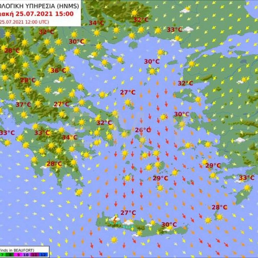 Ο χάρτης των θερμοκρασιών από την ΕΜΥ για σήμερα Κυριακή 25 Ιουλίου