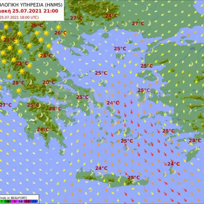 Ανεμοι: Βορειοανατολικοί 3 με 4 και από το μεσημέρι δυτικοί βορειοδυτικοί 4 με 5 μποφόρ.