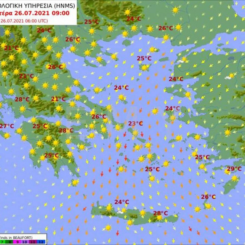 Οι άνεμοι στα δυτικά, τα κεντρικά και τα βόρεια θα είναι ασθενείς και από το μεσημέρι στα δυτικά βορειοδυτικοί 3 με 5 μποφόρ. Στα υπόλοιπα θα πνέουν από βόρειες διευθύνσεις 4 με 6 και στο κεντρικό και νότιο Αιγαίο τοπικά 7 μποφόρ.