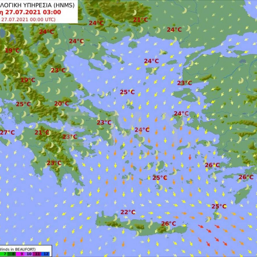 Θερμοκρασία: Από 24 έως 34 βαθμούς Κελσίου. Στα ανατολικά η μέγιστη θα είναι 2 με 3 βαθμούς χαμηλότερη.