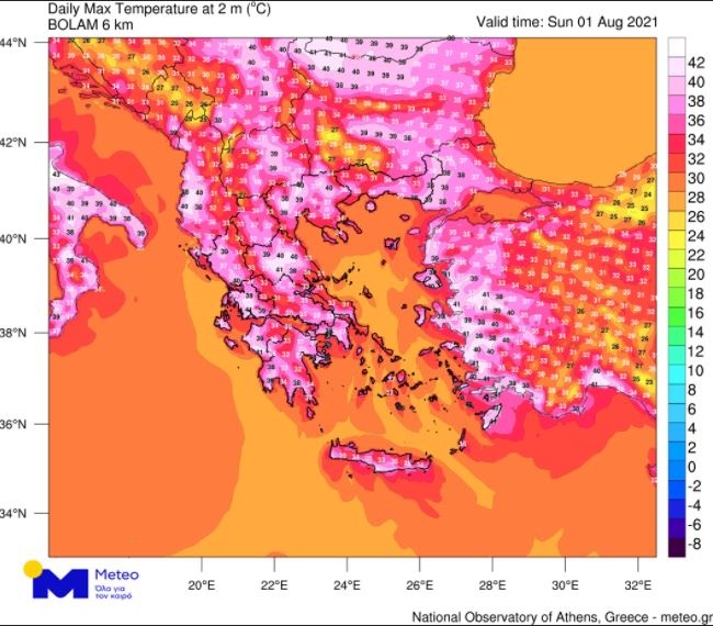 Ισχυρός καύσωνας με μέγιστες θερμοκρασίες στους 44-45 βαθμούς Κελσίου. Υψηλές ελάχιστες και πολύ έντονο αίσθημα δυσφορίας στα αστικά κέντρα. Βορειοδυτικοί άνεμοι με εντάσεις έως 5 μποφόρ, και τοπικά στο Νότιο Αιγαίο 6 μποφόρ.