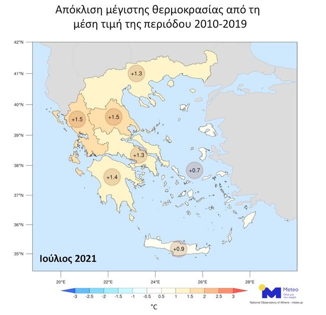 Στα νησιά του Αν. Αιγαίου, τις Κυκλάδες και τα Δωδεκάνησα ήταν ο πιο θερμός Ιούλιος της δεκαετίας, θερμότερος κατά 0,1°C από τον ακραίο μήνα του 2018. Στα ηπειρωτικά τμήματα και στην Κρήτη, ο φετινός Ιούλιος ήταν περίπου 1°C πιο ψυχρός από τον εξαιρετικά θερμό Ιούλιο του 2012. Ο χάρτης παρουσιάζει τις αποκλίσεις της μέγιστης ημερήσιας θερμοκρασίας σε 7 γεωγραφικά διαμερίσματα της Ελλάδας.