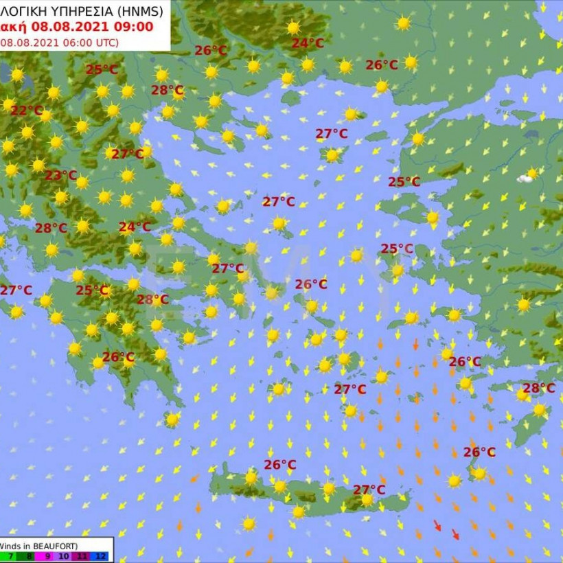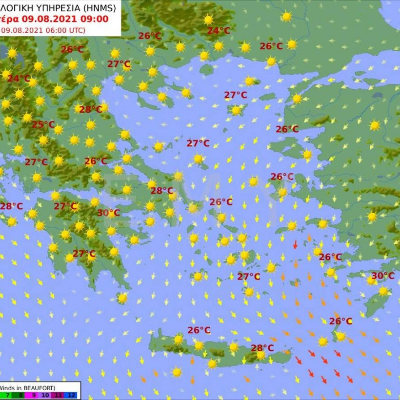 Θερμοκρασία: Από 24 έως 32 και στην Κρήτη τοπικά έως 35 βαθμούς Κελσίου.