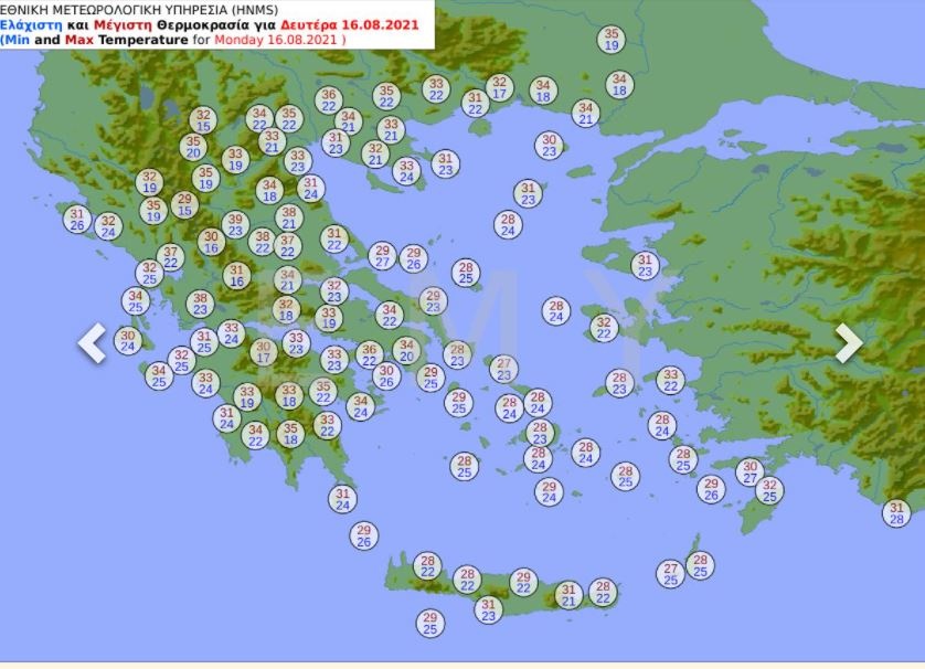Θερμοκρασία: Από 18 έως 37 και στη δυτική Μακεδονία από 13 έως 35 βαθμούς Κελσίου.