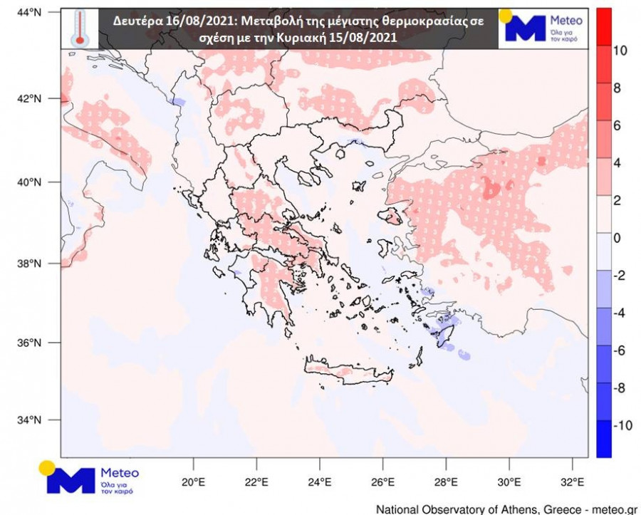 Ιδιαίτερα για σήμερα, Δευτέρα 16/08, θα σημειωθεί άνοδος της τάξης των 2 έως 3 βαθμών Κελσίου σε μεγάλο μέρος των ηπειρωτικών και της Κρήτης. Στον χάρτη που ακολουθεί, με κόκκινες αποχρώσεις σημειώνονται οι περιοχές όπου αναμένεται άνοδος της θερμοκρασίας. Στην Αθήνα το θερμόμετρο το μεσημέρι θα φτάσει κατά τόπους τους 32-34 βαθμούς, στη Θεσσαλονίκη τους 31-33 βαθμούς, στην Πάτρα τους 35-37 βαθμούς, στη Λάρισα τους 36-38 βαθμούς και στο Ηράκλειο τους 28-30 βαθμούς Κελσίου.