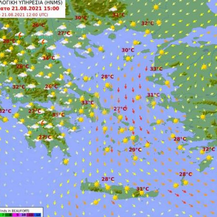 Θερμοκρασία: Από 23 έως 30 και κατά τόπους στη Κρήτη 33 βαθμούς Κελσίου.