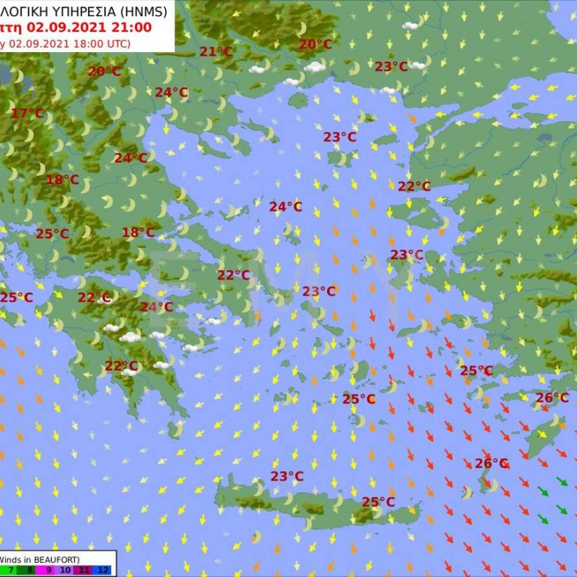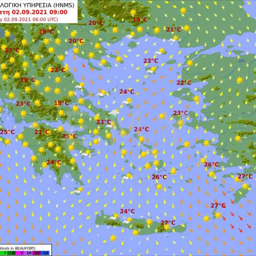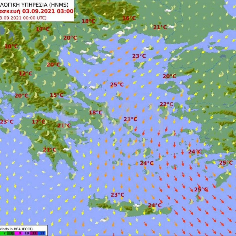 Ανεμοι: Από βόρειες διευθύνσεις 5 με 6 και στα ανατολικά τοπικά 7 μποφόρ.