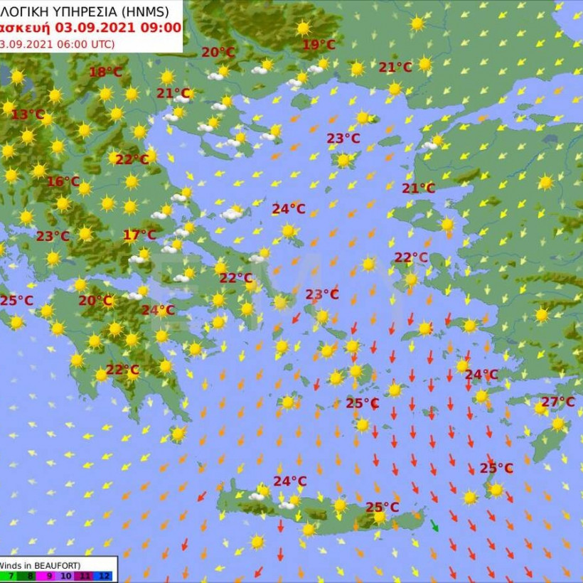 Θερμοκρασία: Από 24 έως 32 βαθμούς Κελσίου. Στα ανατολικά η μέγιστη θα είναι 2 με 3 βαθμούς χαμηλότερη.