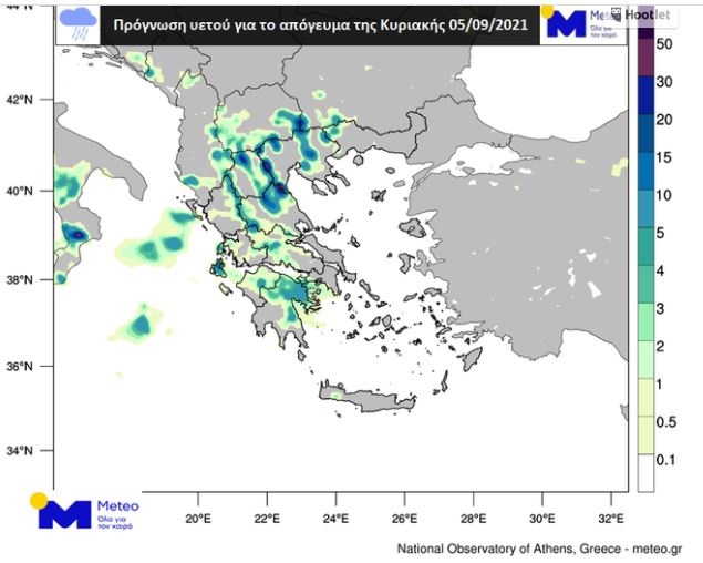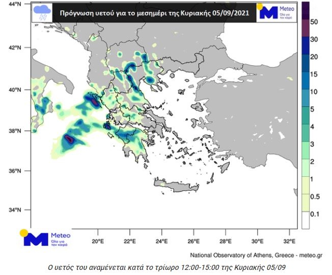 Στους χάρτες του meteo παρουσιάζεται ενδεικτικά ο υετός που αναμένεται το μεσημέρι (12:00-15:00) και το απόγευμα (15:00-18:00) της Κυριακής 05/09. Τα φαινόμενα θα παρουσιάσουν εξασθένηση κατά της διάρκεια της νύχτας της Κυριακής 05/09 προς Δευτέρα 06/09.