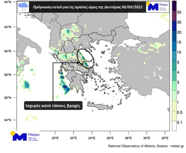 Παρά τη γενικότερη τάση εξασθένησης των φαινόμενων κατά τη διάρκεια της νύχτας της Κυριακής 05/09 προς Δευτέρα 06/09, στην Βόρεια Εύβοια, στην Ανατολική Θεσσαλία και στις Σποράδες αναμένονται ισχυρές κατά τόπους βροχοπτώσεις από αργά το βράδυ της Κυριακής 05/09 έως το πρωί της Δευτέρας 06/09. Λόγω των πρόσφατων πυρκαγιών στη Βόρεια Εύβοια συνιστάται προσοχή, μιας και μπορεί να προκαλέσουν πλημυρικά φαινόμενα.