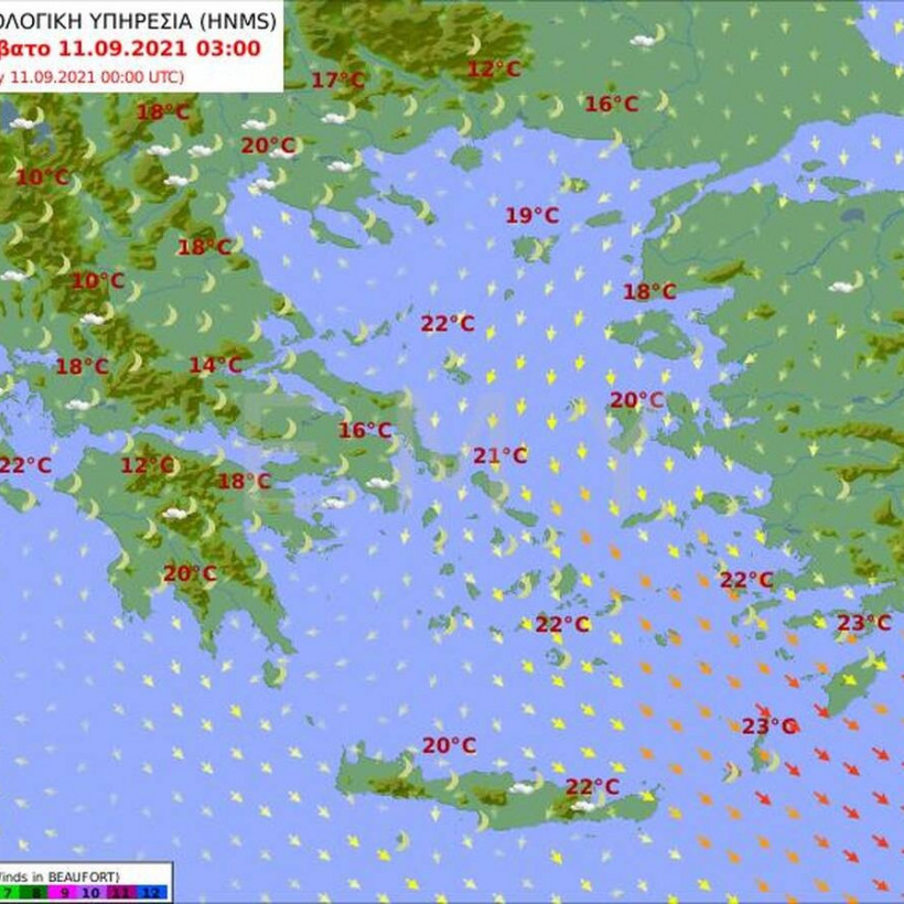 Άνεμοι: Από βόρειες διευθύνσεις 4 με 6 και από τις απογευματινές ώρες στα Δωδεκάνησα τοπικά έως 7 μποφόρ.