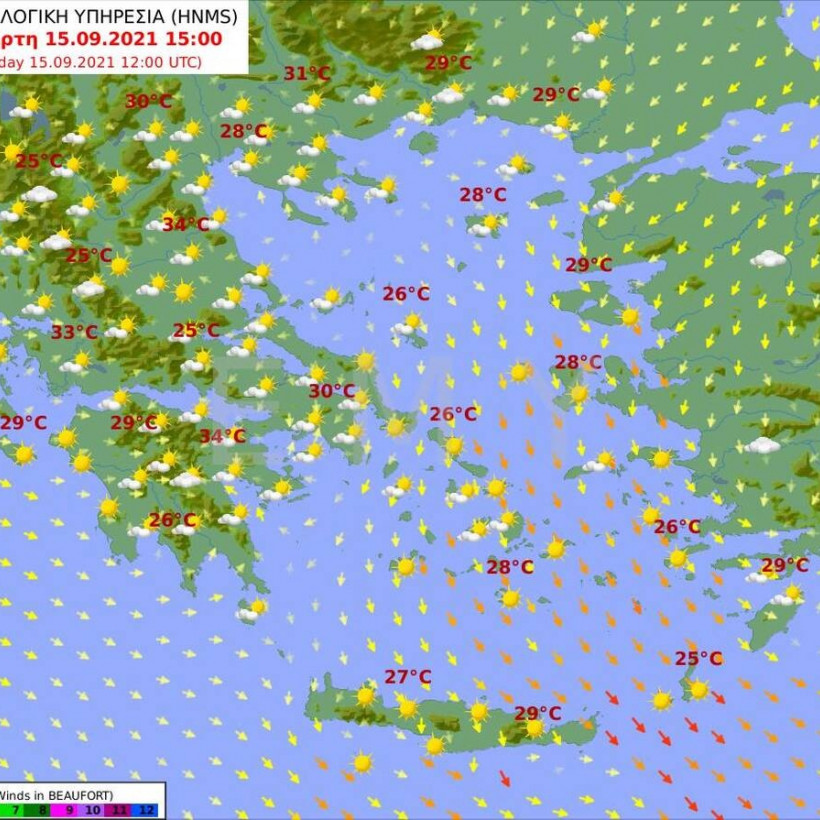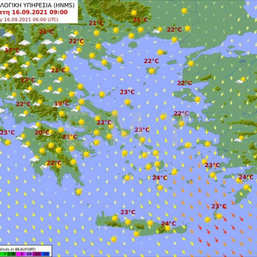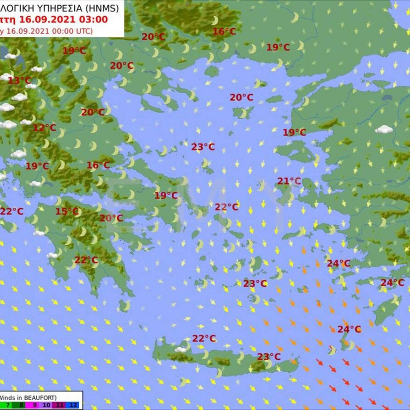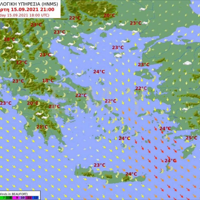 Οι άνεμοι θα πνέουν βόρειοι βορειοδυτικοί 3 με 5, στο Αιγαίο τοπικά 6 και από το απόγευμα στα νοτιοανατολικά έως 7 μποφόρ.