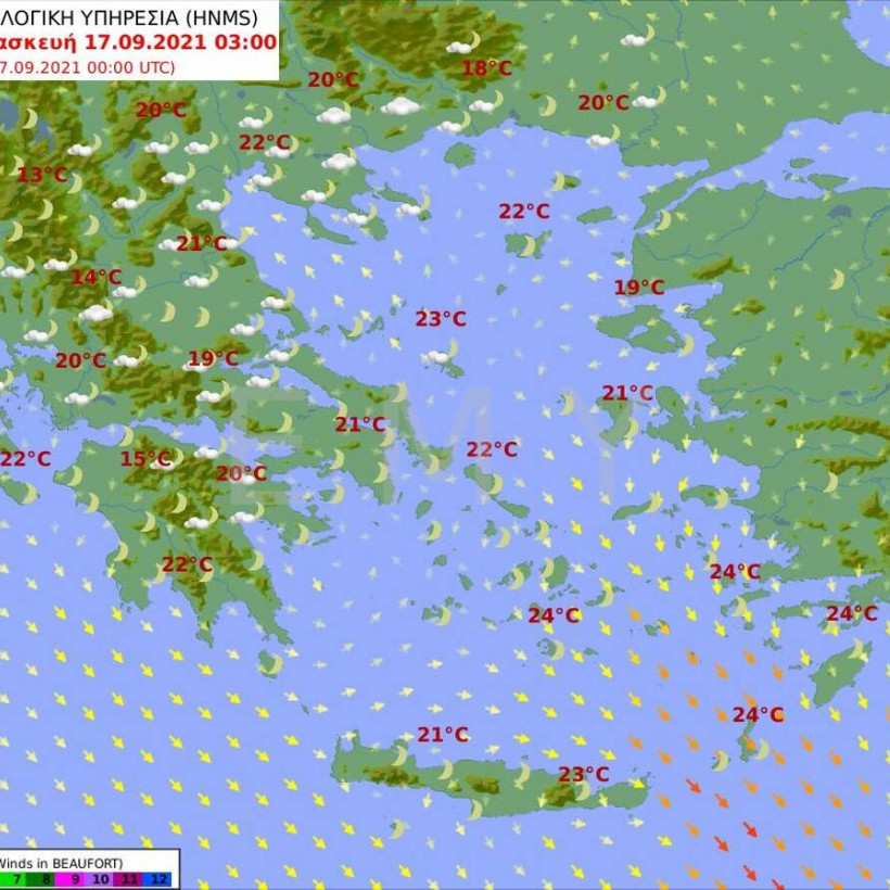 Οι άνεμοι θα πνέουν βόρειοι βορειοδυτικοί, στο Αιγαίο τοπικά 6 και πρόσκαιρα στα νοτιοανατολικά έως 7 μποφόρ.