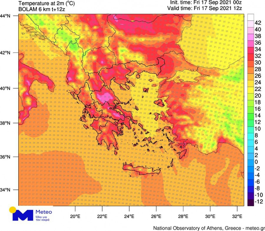 Η μέγιστη τιμή της θερμοκρασίας αναμένεται να φτάσει τους 34-36 βαθμούς Κελσίου στα κεντρικά και βόρεια ηπειρωτικά, τους 30-33 βαθμούς Κελσίου στα δυτικά και νότια ηπειρωτικά τμήματα ενώ στα νησιωτικά τμήματα η θερμοκρασία δεν αναμένεται να ξεπεράσει τους 30 βαθμούς Κελσίου.