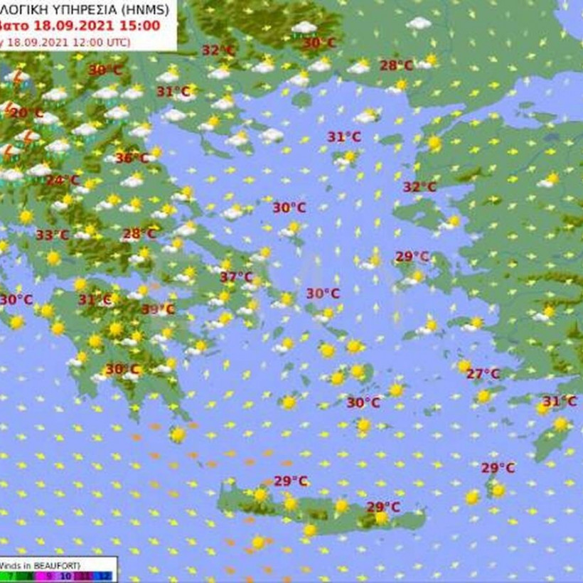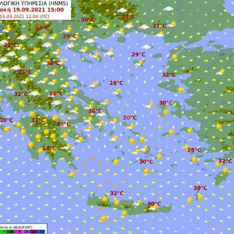 Θερμοκρασία: Από 21 έως 30,στην Κρήτη κατά τόπους έως 33 βαθμούς Κελσίου.