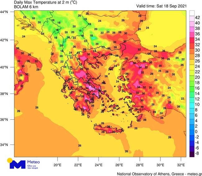 Σύμφωνα με τα προγνωστικά στοιχεία του Εθνικού Αστεροσκοπείου Αθηνών / meteo.gr, μέγιστες θερμοκρασίες της τάξης των 35-37 βαθμών Κελσίου αναμένονται το Σάββατο 18 Σεπτεμβρίου 2021.