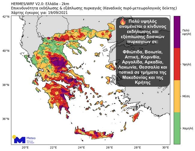 Ιδιαίτερα δυσμενείς πυρο-μετεωρολογικές συνθήκες αναμένεται να επικρατήσουν στη χώρα μας και ειδικότερα στα ανατολικά ηπειρωτικά τμήματα αυτής, κατά την Κυριακή 19 και τη Δευτέρα 20 Σεπτεμβρίου 2021. Με βάση τον Καναδικό πυρομετεωρολογικό δείκτη που υπολογίζει επιχειρησιακά το Εθνικό Αστεροσκοπείο Αθηνών / meteo.gr, πολύ υψηλή επικινδυνότητα αναμένεται σήμερα, Κυριακή 19 Σεπτεμβρίου 2021, σε Φθιώτιδα, Βοιωτία, Αττική, Κορινθία, Αργολίδα, Αρκαδία, Λακωνία, Θεσσαλία και τοπικά σε τμήματα της Μακεδονίας και της Κρήτης (Εικόνα 2).