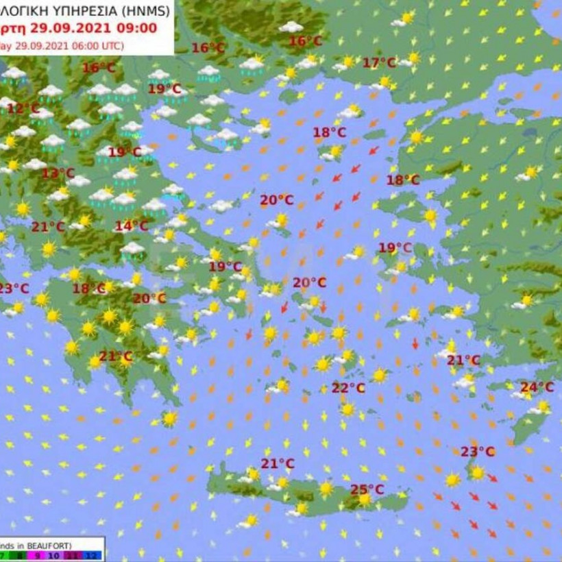 Οι άνεμοι θα πνέουν στα ανατολικά βόρειοι 4 με 6 και στο Αιγαίο 6 με 7 μποφόρ. Στα δυτικά θα πνέουν νότιοι νοτιοανατολικοί 3 με 5 μποφόρ.