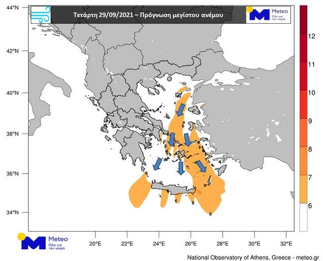 Ενισχυμένοι βόρειοι άνεμοι στο Αιγαίο και τοπικά φαινόμενα αναμένονται την Τετάρτη 29/09, σύμφωνα με τα τελευταία προγνωστικά δεδομένα του Εθνικού Αστεροσκοπείου Αθηνών / meteo.gr. Πιο αναλυτικά, στα 7 μποφόρ θα φτάσουν κατά τόπους οι βόρειοι άνεμοι στο Αιγαίο, ενώ στο Ιόνιο θα είναι μεταβαλλόμενοι έως 4 μποφόρ. Στον σχετικό Χάρτη παρουσιάζονται οι περιοχές όπου ο άνεμος θα ξεπεράσει τα 6 μποφόρ καθώς και η επικρατούσα διεύθυνσή του.