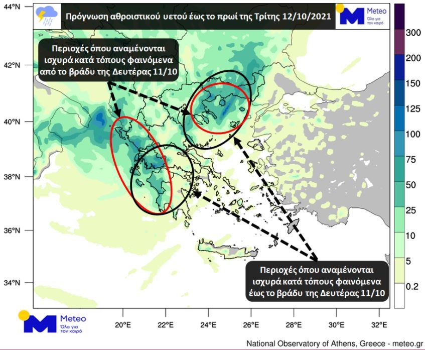 Στον χάρτη που ακολουθεί παρουσιάζεται ο αθροιστικός υετός που αναμένεται έως το πρωί της Τρίτης 12/10 καθώς και οι περιοχές που αναμένονται τα ισχυρότερα φαινόμενα έως το βράδυ της Δευτέρας 11/10 (μαύρες ελλείψεις) και από το βράδυ της Δευτέρας 11/10 έως το πρωί της Τρίτης 12/10 (κόκκινες ελλείψεις).
