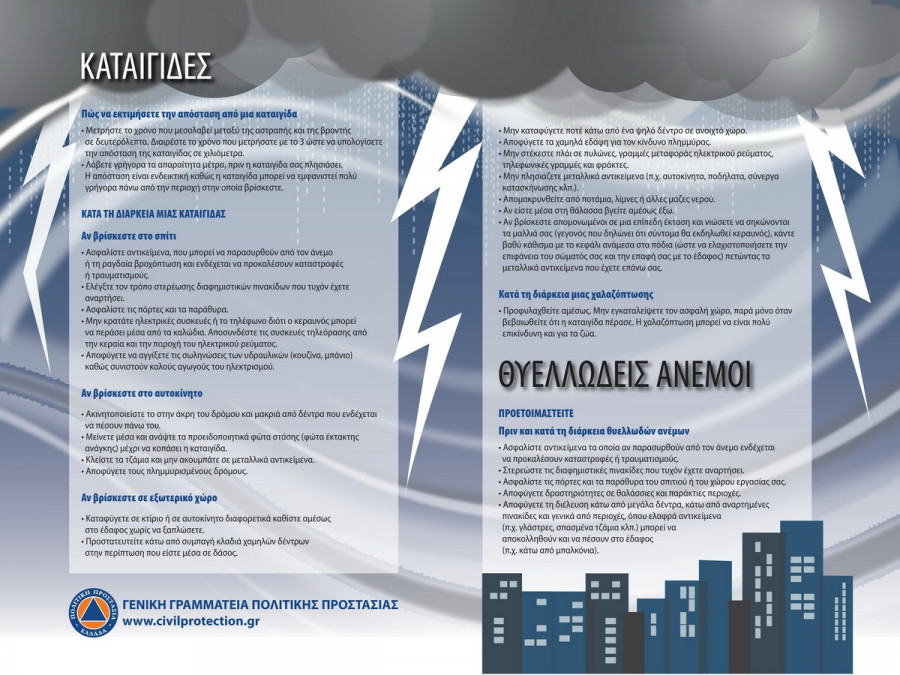 Παράλληλα, η γενική γραμματεία Πολιτικής Προστασίας συνιστά στους πολίτες να είναι ιδιαίτερα προσεκτικοί, μεριμνώντας για τη λήψη μέτρων αυτοπροστασίας από κινδύνους που προέρχονται από την εκδήλωση των έντονων καιρικών φαινομένων.