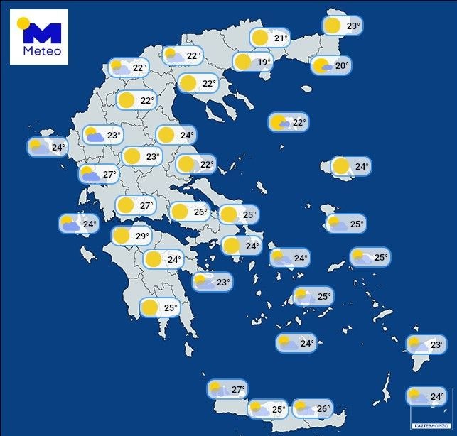Θερμοκρασία: Από 17 έως 25 και στην Κρήτη κατά τόπους 27 βαθμούς Κελσίου.