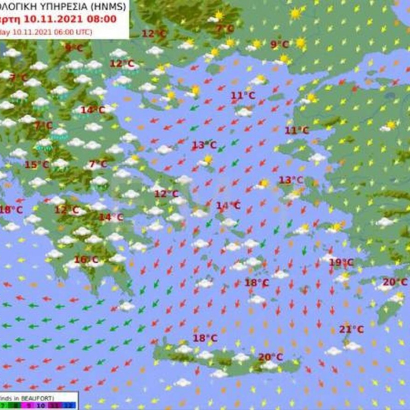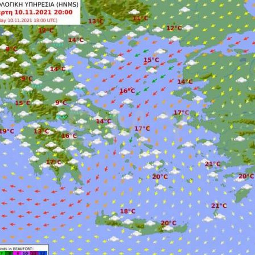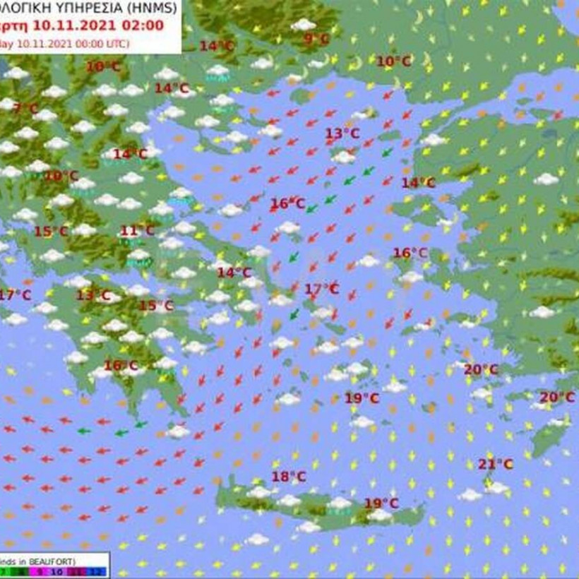Θερμοκρασία: Από 13 έως 21 βαθμούς Κελσίου. Στην Ήπειρο κατά τόπους 4 με 6 βαθμούς χαμηλότερη.