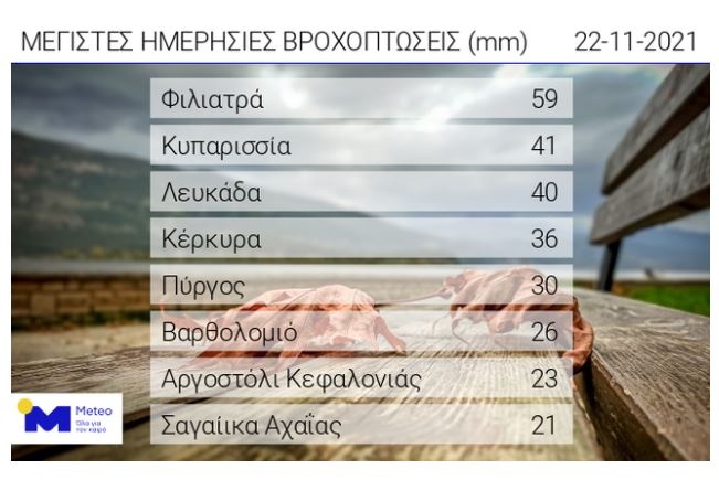 Σύμφωνα με τις καταγραφές του δικτύου αυτόματων μετεωρολογικών σταθμών του Εθνικού Αστεροσκοπείου Αθηνών / meteo.gr, βροχοπτώσεις εκδηλώθηκαν έως τις απογευματινές ώρες της Δευτέρας 22 Νοεμβρίου κυρίως στα δυτικά τμήματα της χώρας. Το μεγαλύτερο ύψος βροχής μέχρι τις 19:00 καταγράφηκε στο μετεωρολογικό σταθμό Φιλιατρών και ήταν ίσο με 59 χιλιοστά. Στον πίνακα που ακολουθεί παρουσιάζονται οι 8 σταθμοί που κατέγραψαν τα μεγαλύτερα ύψη βροχής.