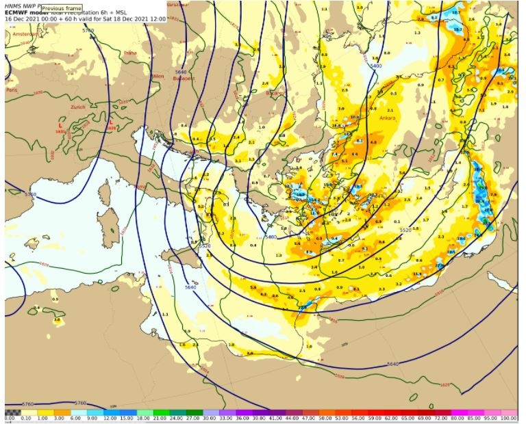 Για την Ελλάδα εκδόθηκε έκτακτο δελτίο από την ΕΜΥ στο οποίο επισημαίνεται ότι ο καιρός θα παρουσιάσει επιδείνωση το Σαββάτο (18-12-21) και την Κυριακή (19-12-21) με κύρια χαρακτηριστικά τις κατά τόπους ισχυρές βροχές και καταιγίδες, τις χιονοπτώσεις στα κεντρικά και τα νότια και τους θυελλώδεις ανέμους.