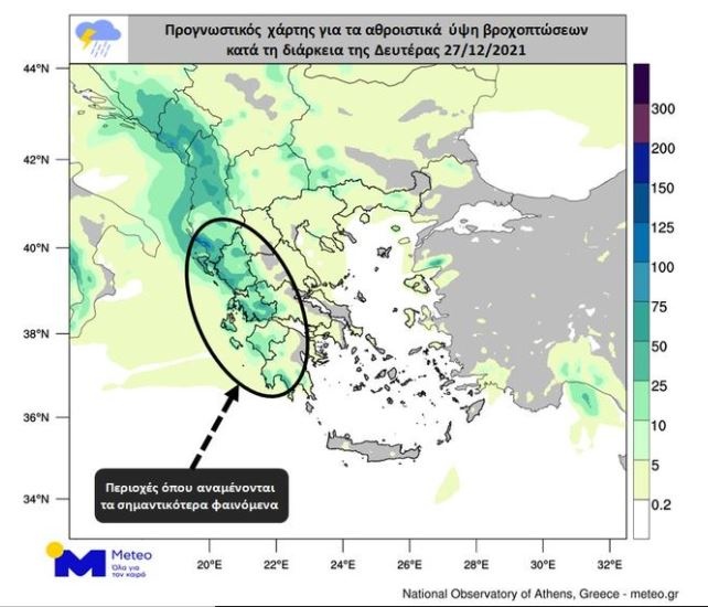 Σύμφωνα με τα προγνωστικά στοιχεία του Εθνικού Αστεροσκοπείου Αθηνών / meteo, βροχοπτώσεις και σποραδικές καταιγίδες αναμένεται να εκδηλωθούν τη Δευτέρα 27/12 σε αρκετές περιοχές της χώρας. Περισσότερo θα επηρεαστούν η Δυτική και Βόρεια Ελλάδα, ενώ στα δυτικά τα φαινόμενα θα είναι κατά τόπους ισχυρά.