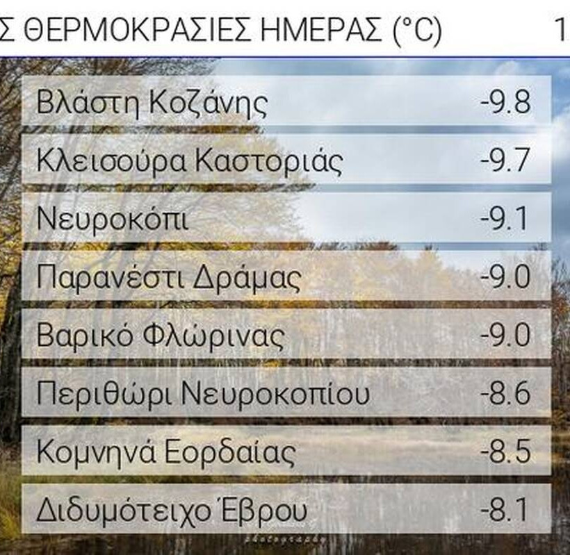 Οι χαμηλότερες τιμές, σύμφωνα με το δίκτυο αυτόματων μετεωρολογικών σταθμών του Εθνικού Αστεροσκοπείου Αθηνών / meteo.gr, σημειώθηκαν στη Βλάστη Κοζάνης (-9,7) και στην Κλεισούρα Καστοριάς (-9,5), ενώ στο Βαρικό Φλώρινας το θερμόμετρο έπεσε στους -8,9 βαθμούς Κελσίου, θερμοκρασία που καταγράφηκε και στο Νευροκόπι Δράμας. Τσουχτερό κρύο επικρατεί και στη Θράκη με τις χαμηλότερες τιμές να καταγράφονται στους Μεταξάδες Έβρου (- 7,3) και στο Διδυμότειχο (-6,9).