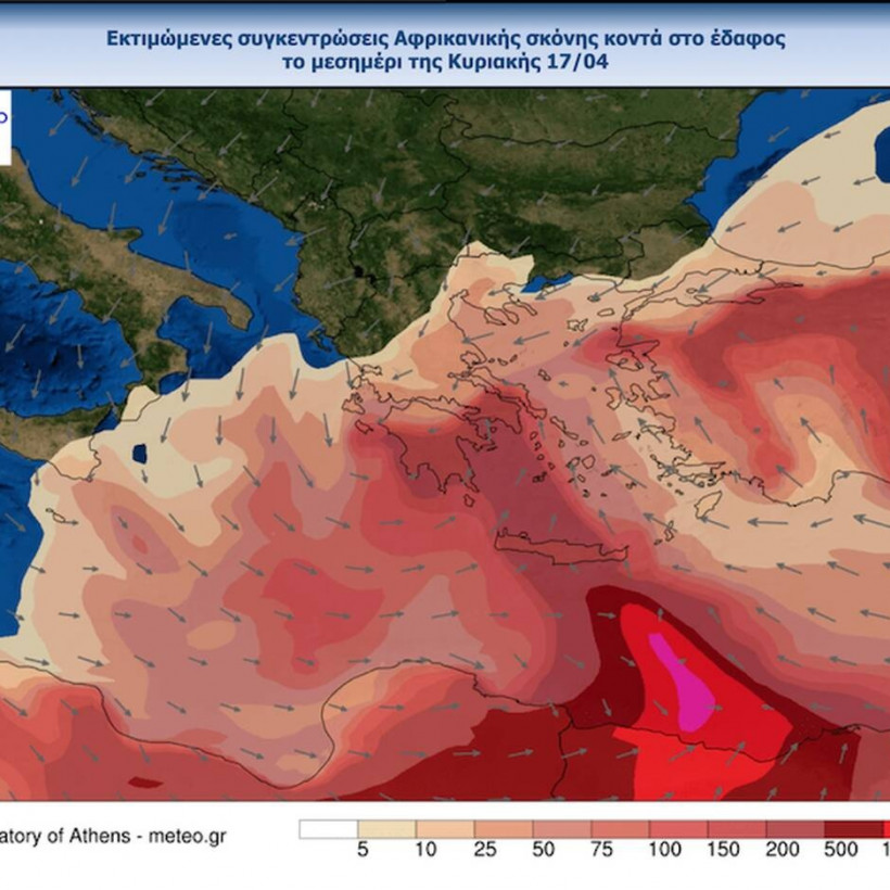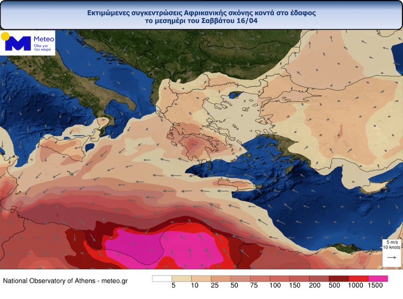 Εικόνα 1: Εκτιμώμενες συγκεντρώσεις Αφρικανικής σκόνης κοντά στο έδαφος το μεσημέρι του Σαββάτου 16/04 από το προγνωστικό σύστημα DUSTMETEO του Εθνικού Αστεροσκοπείου Αθηνώνmeteo.gr