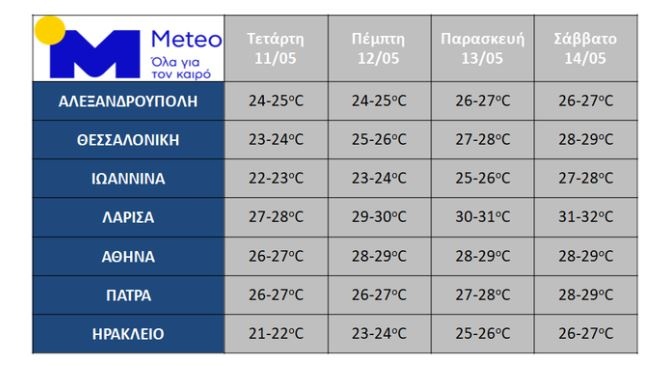 Σύμφωνα με τα τελευταία προγνωστικά δεδομένα του Εθνικού Αστεροσκοπείου Αθηνών/meteo.gr, η θερμοκρασία θα παρουσιάσει σταδιακή άνοδο έως το Σάββατο 14/5, οπότε στα ηπειρωτικά θα ξεπεράσει κατά τόπους τους 30 βαθμούς Κελσίου.