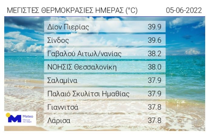 Σύμφωνα με το δίκτυο των αυτόματων μετεωρολογικών σταθμών του Εθνικού Αστεροσκοπείου Αθηνών/meteo.gr, οι υψηλότερες μέγιστες θερμοκρασίες κατά τις μεσημεριανές ώρες σήμερα καταγράφηκαν στο Δίον Πιερίας με 39,9 βαθμούς, στη Σίνδο (39,6), στη Γαβαλού Αιτωολοακαρνανίας (38,2), στο Νόησις Θεσσαλονίκης (38) και στη Σαλαμίνα (37,9 βαθμοί).