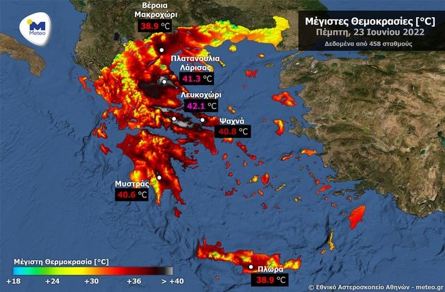 Η ανάλυση των καταγραφών των σταθμών του δικτύου αυτόματων μετεωρολογικών σταθμών του Εθνικού Αστεροσκοπείου Αθηνών/meteo.gr, έδειξε ότι το φράγμα των 40 βαθμών Κελσίου ξεπεράστηκε σε 18 από αυτούς, με την μεγαλύτερη θερμοκρασία να καταγράφεται στο Λευκοχώρι Φθιώτιδας (42,1 βαθμοί Κελσίου) Ακολούθησαν Κωπαΐδα (41,6), Πλατανούλια Λάρισας (41,3), Λιβαδειά (41,1), Αγία Τριάδα Φθιώτιδας (41,1), Λάρισα (40,9), Ψαχνά Ευβοίας (40,8) και 'Αμφισσα (40,7).